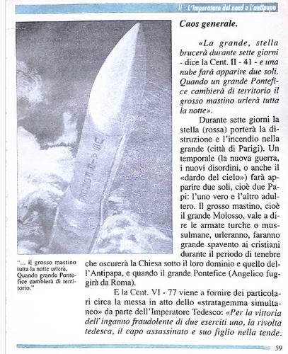 "La grande, stella brucerà durante sette giorni - dice la Cent. II - 41 - e una nube farà apparire due soli. Quando un grande Pontefice cambierà di territorio il grosso mastino urlerà tutta la notte".
