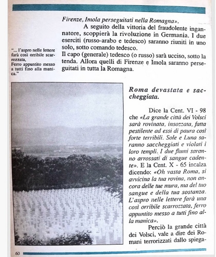 Perciò la grande città dei Volsci, vale a dire dei Romani terrorizzati dallo spiega mento di tante forze nemiche, sarà insozzata dai barbari invasori e resa pestilenziale. Saccheggeranno tutto l'oro e l'argento e violeranno, profaneranno le Chiese, mentre due fiumi (Tevere e Po) saranno arrossati dal sangue di tanti uccisi. Ma questa non sarà proprio la distruzione di Roma (che verrà solo al tempo del vero e ultimo Anticristo), bensì un flagello che sterminerà gran parte dei romani e molti italiani, soprattutto sacerdoti. Spoglierà, infatti, le loro sostanze; dato che l'"aspro in lettere farà tale orribile, devastatrice e vendicatrice scarrozzata avanti e indietro per la Penisola, finché poi tutti egli obbligherà a portare fin'anco sulla manica il suo emblema, cioè il ferro con punte".